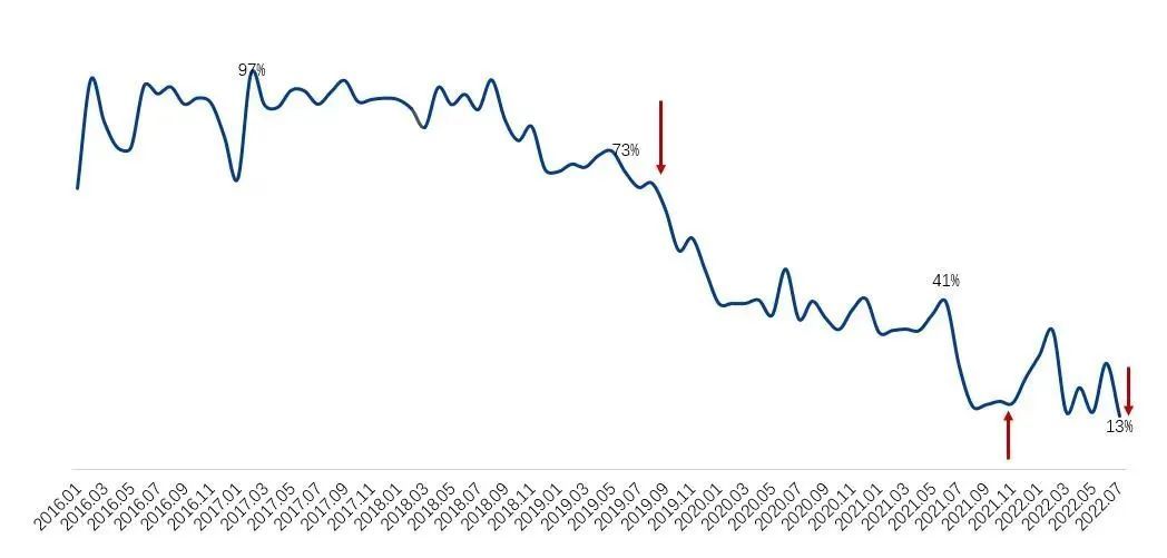 ??不过,武汉市场的供应持续下滑。来自武汉克而瑞的统计数据显示,2022年1-7月供应同比下滑52%,7月单月供应环比下滑19%。7月房企冲刺年中业绩已过,成交量较6月下降5%,供求比0.82,供求关系未进一步恶化。