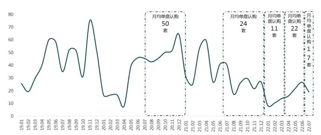 ??今年二季度案场平均认购量较一季度显著回升,单盘月均认购22套,7月由于调控政策放松之后,边际效应递减,较6月认购自然回落,平均单盘认购17套,低于二季度平均水平。